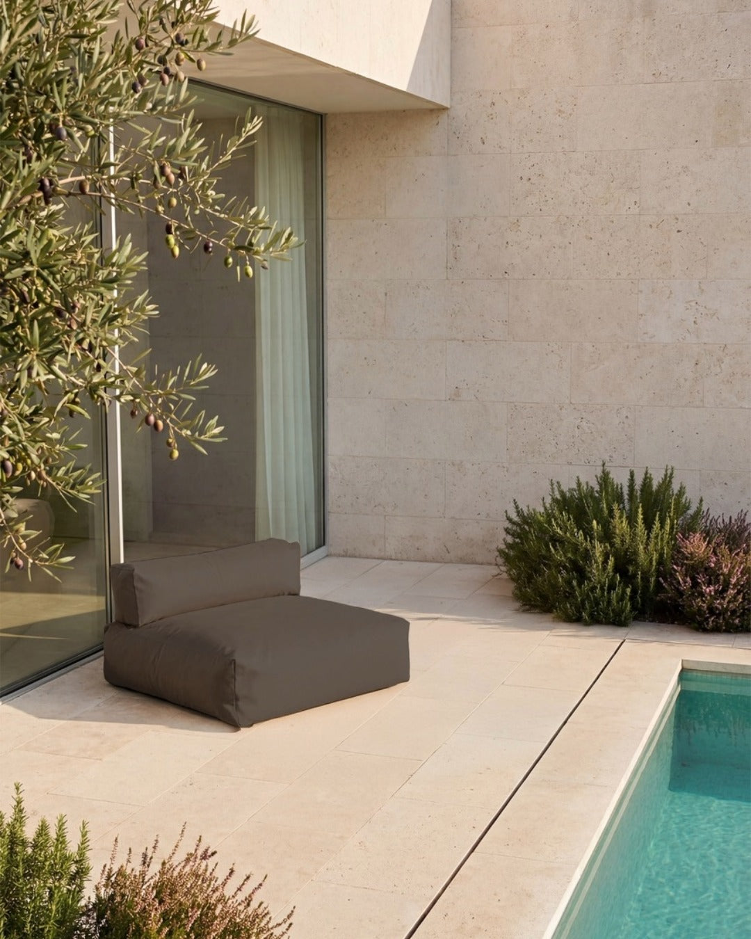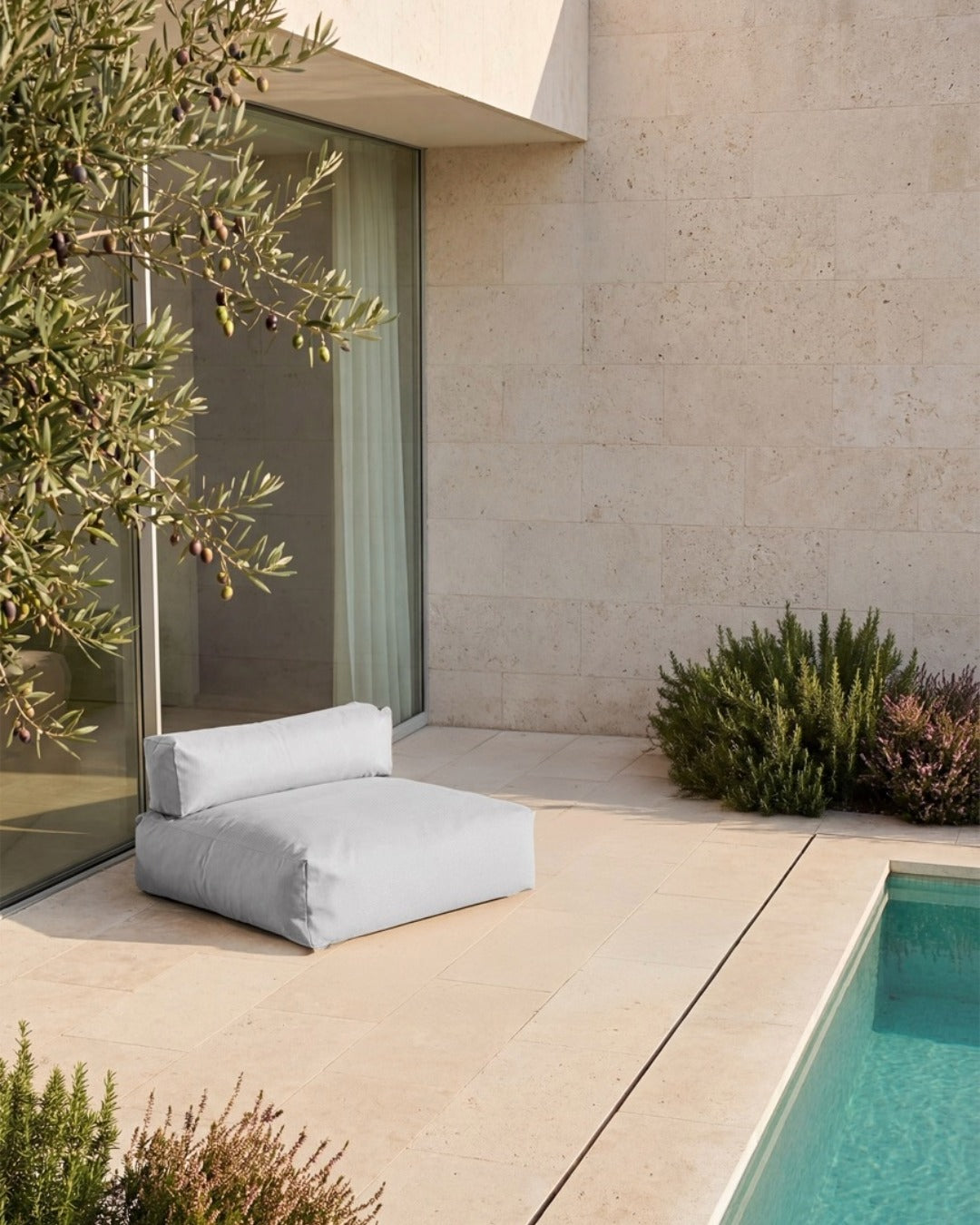 The back cushion has a non-slip coating on the underside. At the same time, the cushion's flexibility allows you to adapt the POOLSOFA to your needs. For example, you can change the position of the back cushion and transform the piece of furniture from a daybed into a seat.