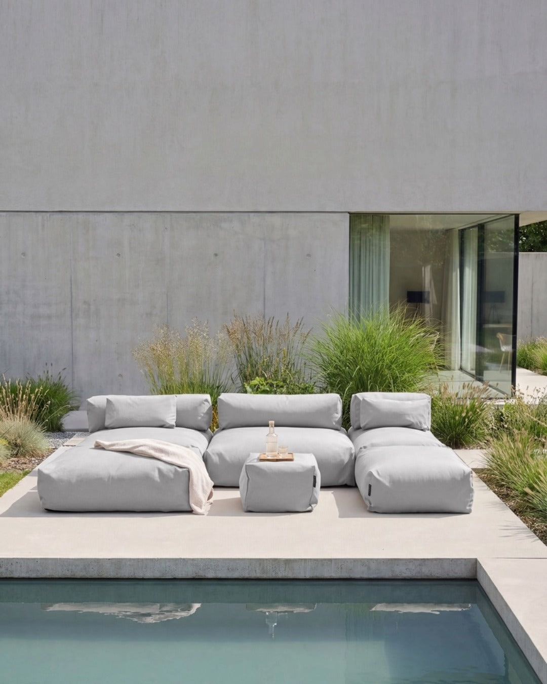 The back cushion has a non-slip coating on the underside. At the same time, the cushion's flexibility allows you to adapt the POOLSOFA to your needs. For example, you can change the position of the back cushion and transform the piece of furniture from a daybed into a seat.
