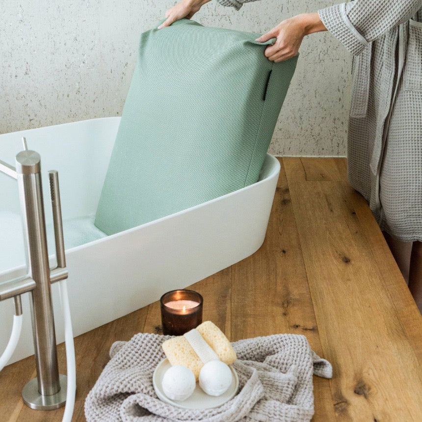 Das BADESOFA ist sowohl im Bezug als auch im Innenkissen schimmel- und stockfleckenresistent ausgestattet. Damit das Kissen seine Eigenschaften langfristig bewahrt, ist es entscheidend sich an unsere Pflegeroutine zu halten.