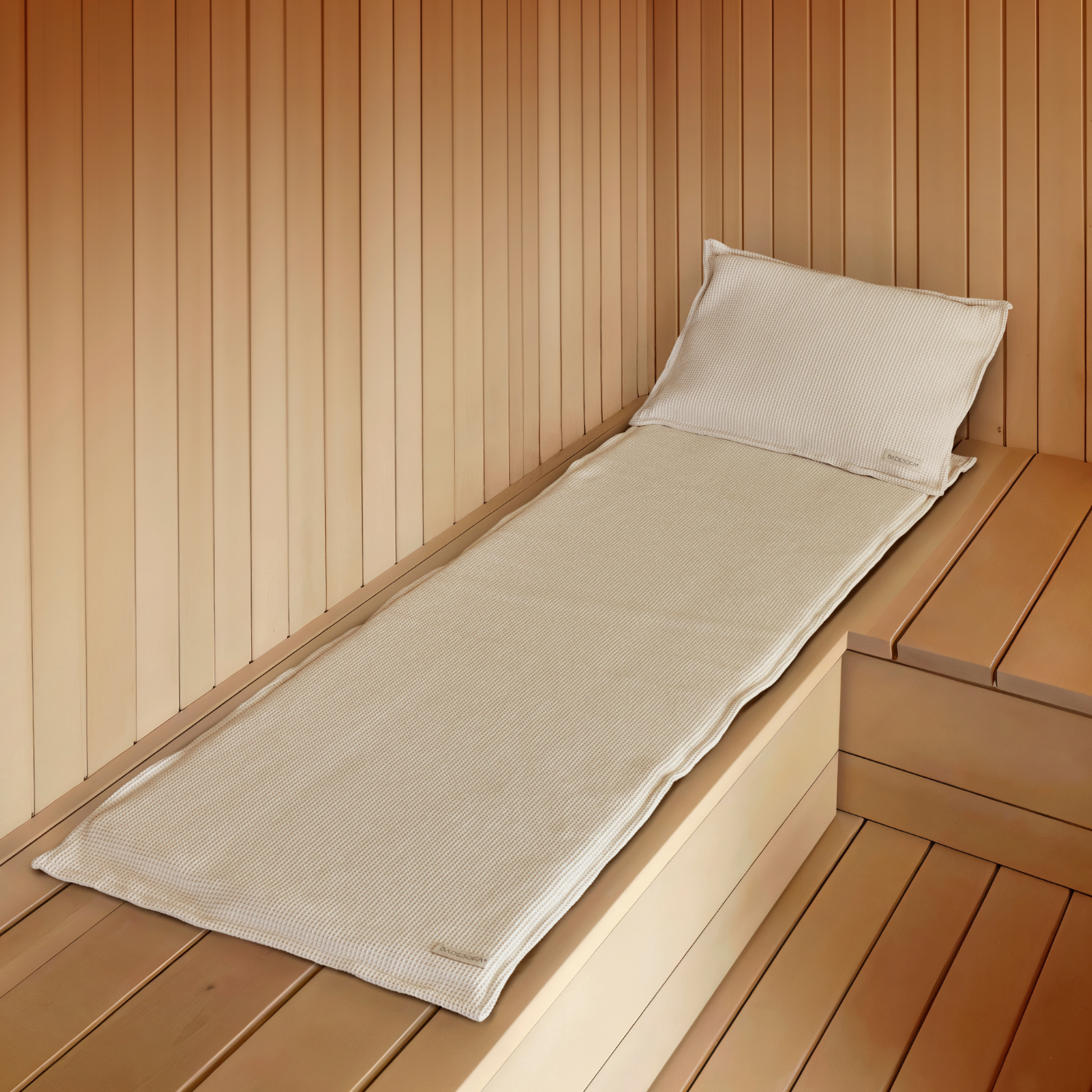Das SAUNASOFA besteht aus einer gepolsterten Saunamatte und einem Kopfkissen. Es wird aus Bio-Baumwolle und recyceltem Kunststoff hergestellt und ist so konzipiert, dass es der Saunahitze standhält, ohne schädliche Substanzen freizusetzen.