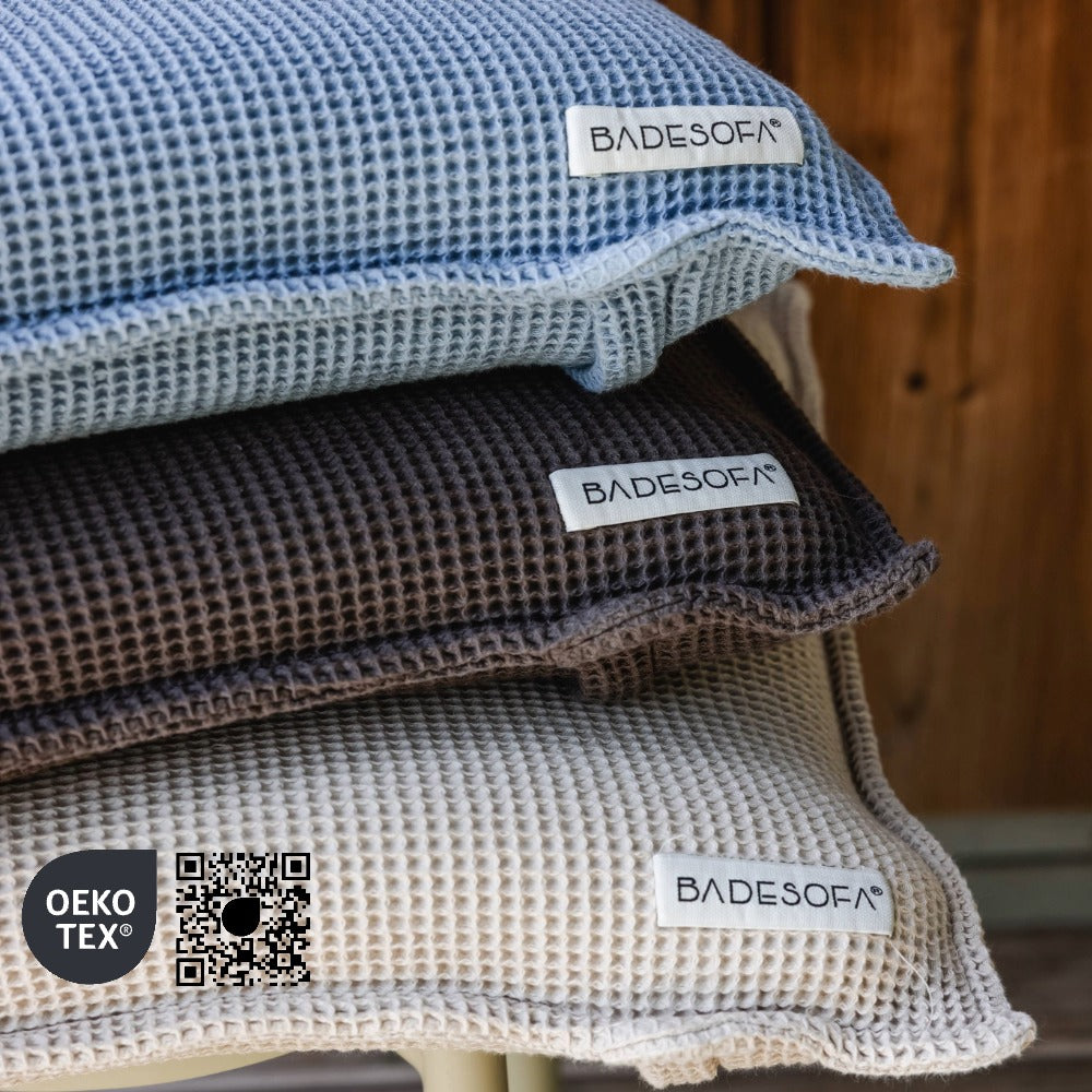 Für unsere SAUNASOFA Collection verwenden wir Materialien, die perfekt auf die klimatischen Bedingungen in der Sauna angepasst sind und den den dortigen Temperaturen ohne Abgabe von Schadstoffen standhalten. Alle Bestandteile der SAUNASOFA Collection sind luftdurchlässig und atmungsaktiv.